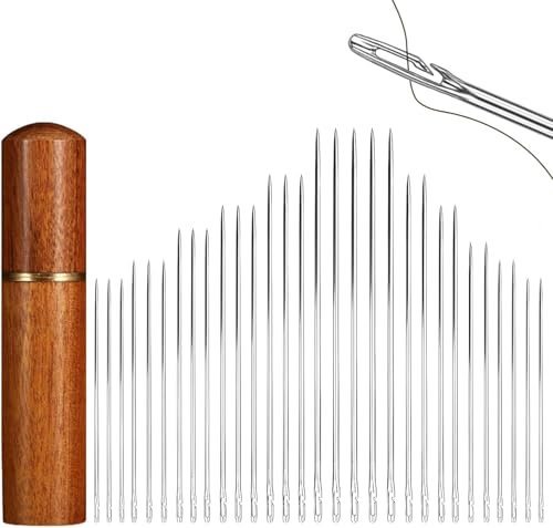 SPIN CART Sewing Needles Set, 30 Pieces, Stainless Steel, Self-Threading Large Eye, 6 Sizes 4.2-6.7 cm, with Wooden Storage Case