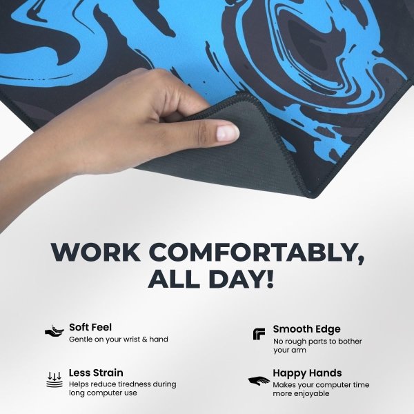 Transform your gaming and work setup with this premium extended mousepad from SPIN CART. Measuring a generous 70 x 30 cm, this XXL pad provides ample space for your mouse, keyboard, and other desktop essentials. The sleek design features a striking abstract pattern in vibrant blue swirls against a dark background, adding a touch of style to your workspace. Crafted with precision, the mousepad includes stitched edges for enhanced durability and a non-slip rubber base that keeps it firmly in place during intense gaming sessions or busy workdays. The cloth surface offers smooth tracking for optimal mouse performance, while the 3mm thickness ensures comfortable wrist support. Perfect for gaming enthusiasts and professionals alike, this mousepad combines functionality with aesthetic appeal. The extended size accommodates both low and high DPI settings, giving you complete control over your movements. Weighing 350 grams, it’s substantial enough to stay put yet light enough to be portable when needed. Compatible with all mouse types and suitable for various applications from gaming to office work.