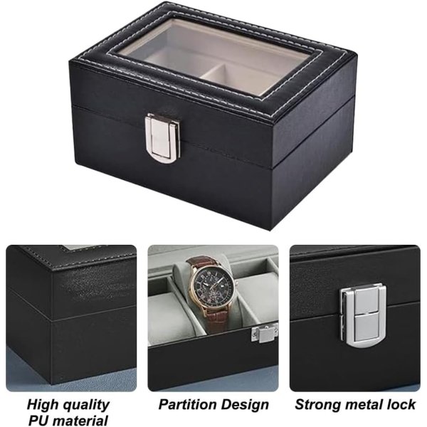 - DESIGN: quality PU leather watch case with transparent glass window lid, elegant white stitching, and durable metal clasp for secure closure