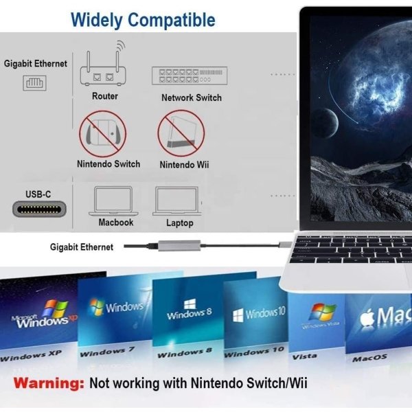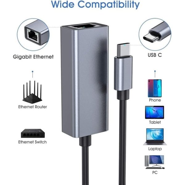 - The USB-C Gigabit Ethernet port supports network speed up to 1000Mbps, downward compatible with 10 /100 Mbps.