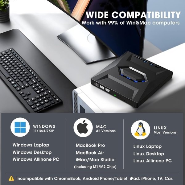 Details: USB CD/DVD RW Drive on your Windows 11/10/8/7, Linux, and Mac computer to play movie DVDs, create your own music CDs, burn photos/videos to DVDs, or copy files from discs to your computer. Please note that this dvd drive is incompatible with Chromebook, Ipad, Tablet, smart phone, iphone, TV, Blue-ray disc, projector