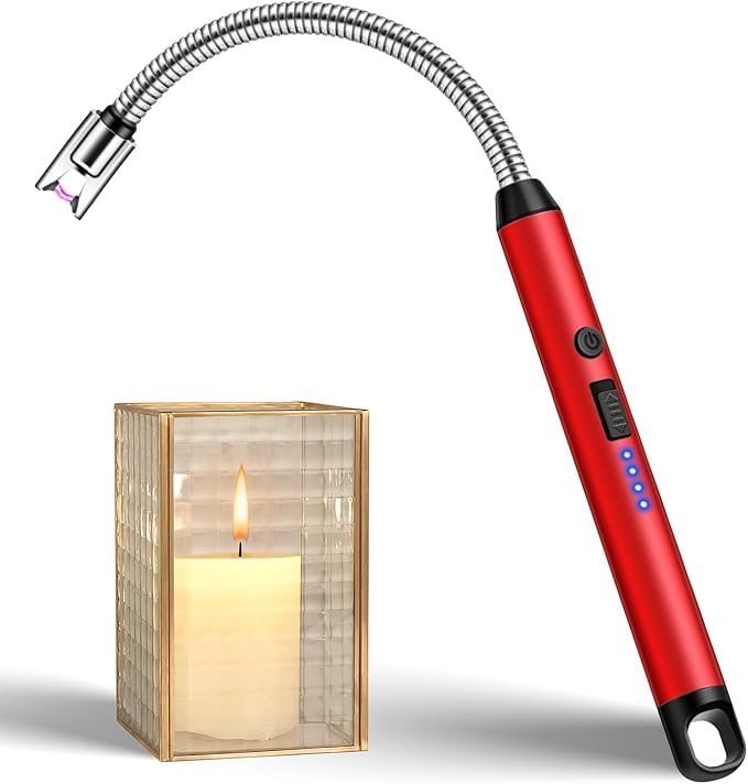 SPIN CART USB Rechargeable Arc Lighter, Flameless Electric Candle Lighter, Red Aluminum, 25cm Long Flexible Neck, LED Battery Indicator, Windproof for BBQ, Stove, Camping